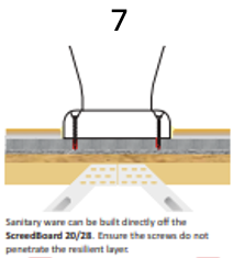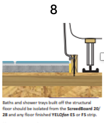 It is recommended that sanitary ware and kitchen units are built off the structural floor with the floor treatment isolated by 8-10mm from the legs or units.